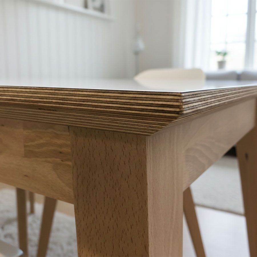 El canto biselado se realiza en madera de abedul, un detalle muy característico de la mesa Adana que añade sofisticación y refuerza su identidad nórdica.