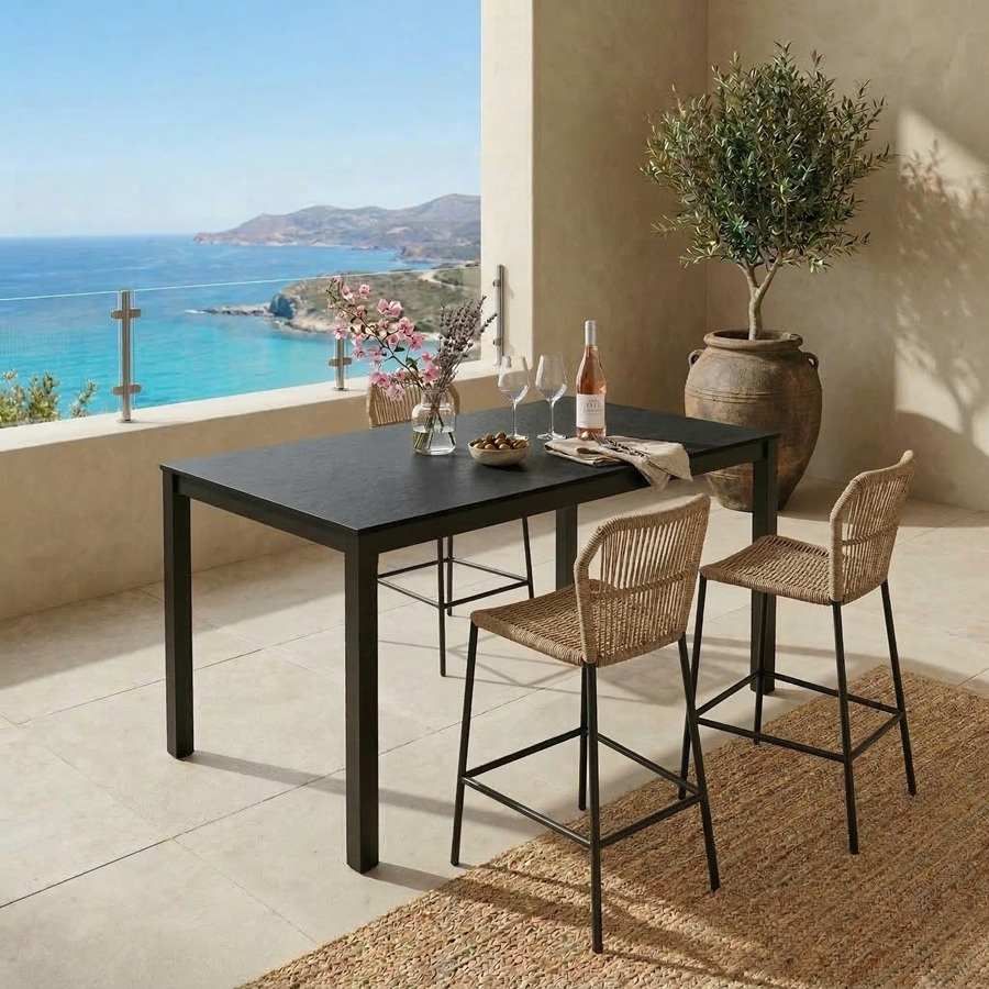 C’est une table fixe pensée pour profiter de l’extérieur au quotidien : petits-déjeuners au soleil, repas en famille ou dîners entre amis, avec une esthétique épurée qui décore sans surcharger. Une option résistante et fonctionnelle pour garder votre terrasse soignée toute l’année.