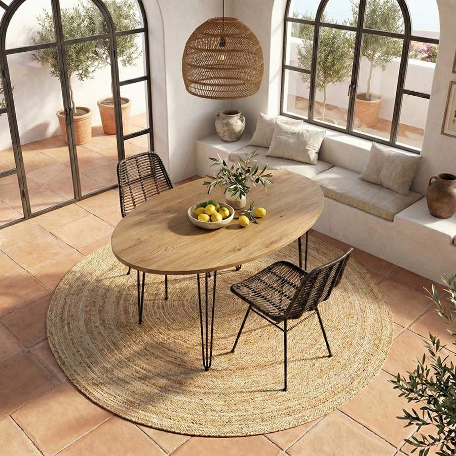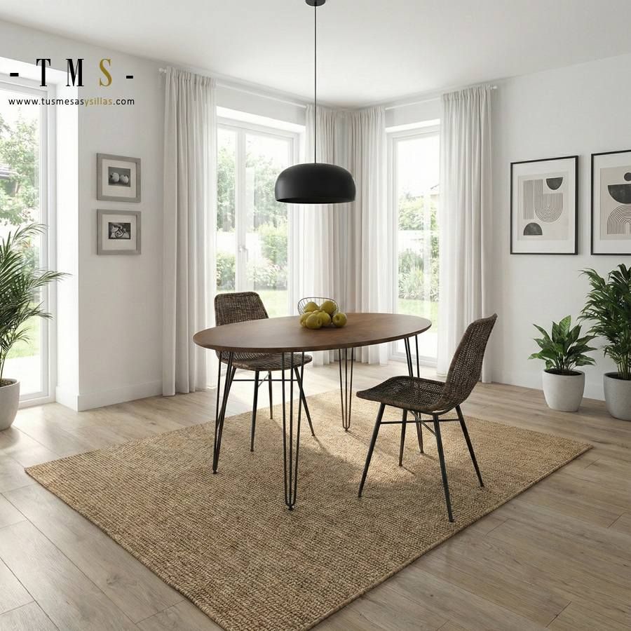 Mesas ovaladas de estilo vintage en madera y patas metálicas.