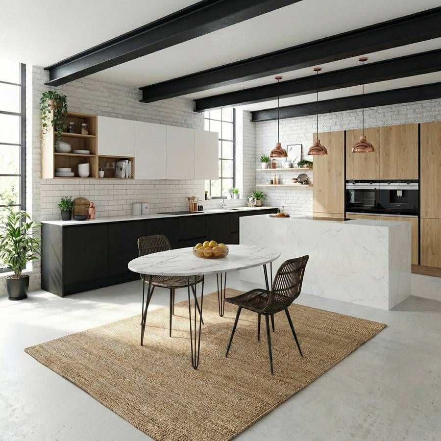 En este caso con encimera ovalada, que facilita un mejor tránsito alrededor de la mesa, ya que evitan ángulos rectos o esquinas, y es una práctica y elegante opción decorativa que la convierte en el centro de atención de la estancia.