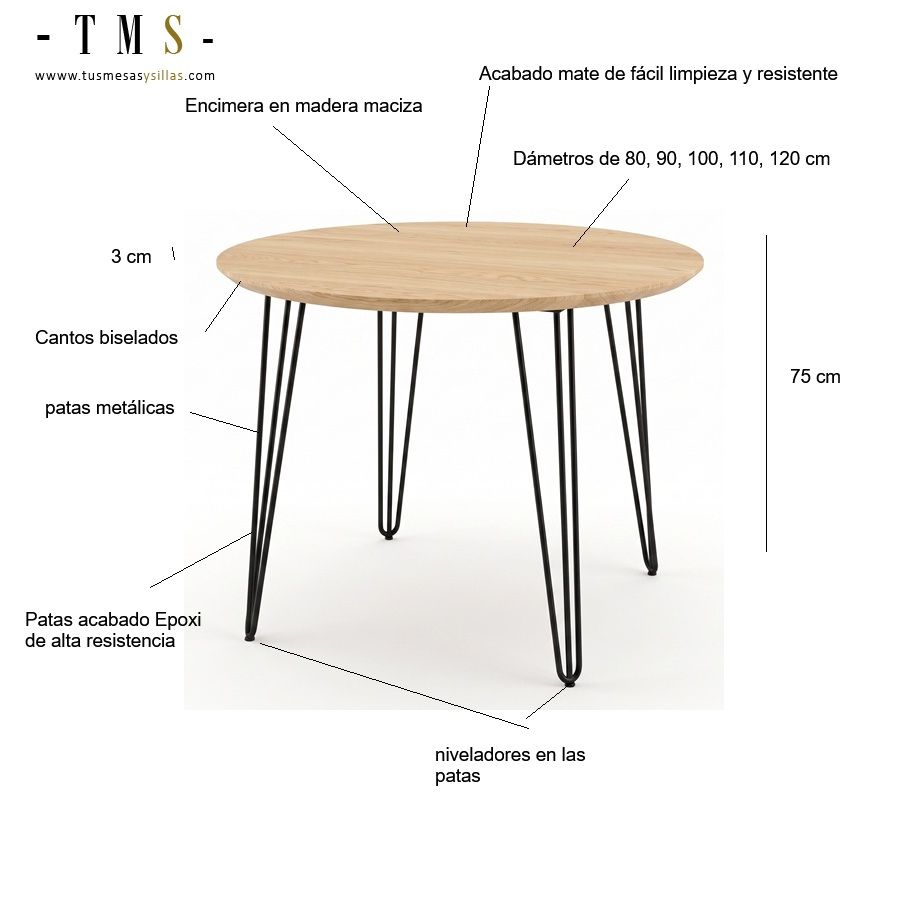 Precios y medidas de mesas redondas con encimera de madera maciza en roble o haya de estilo vintage industrial y patas metálicas.