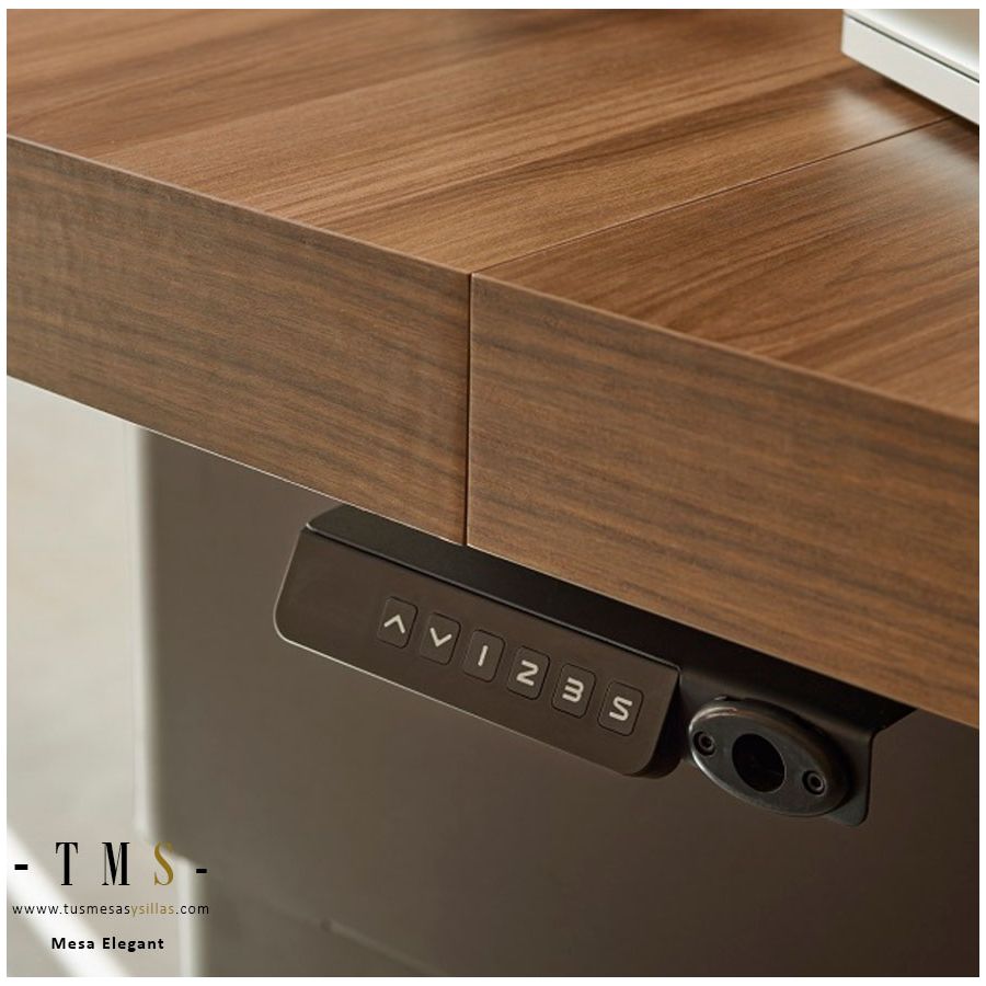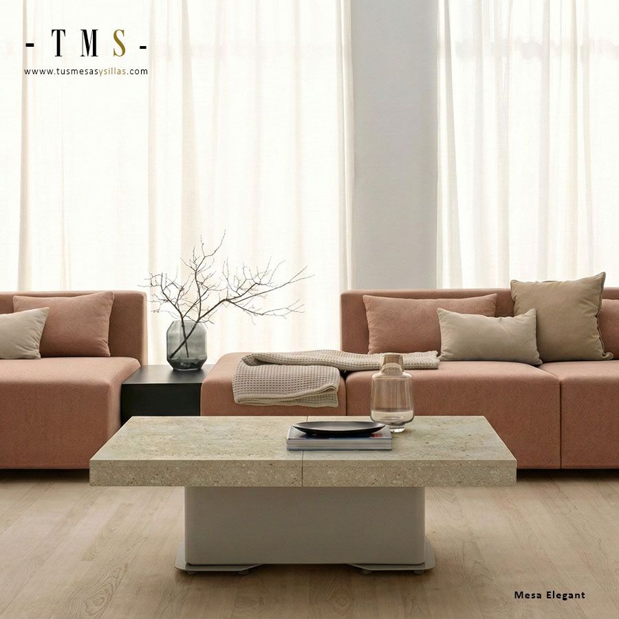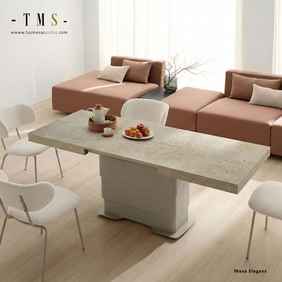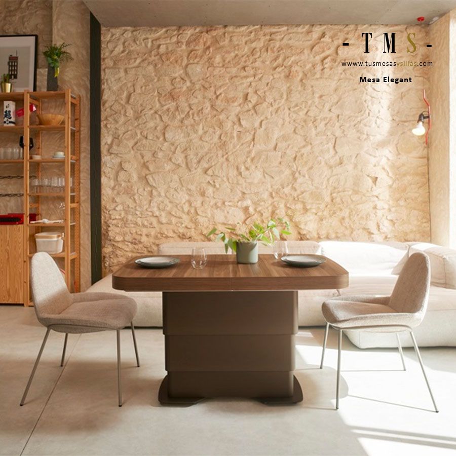 Elegant es una mesa multifuncional pensada para aprovechar el espacio: de mesa de centro pasa a mesa de comedor con un sistema elevable y un sobre extensible. Su diseño combina pie metálico y un tablero personalizable con acabados en chapa natural o melamínicos.
