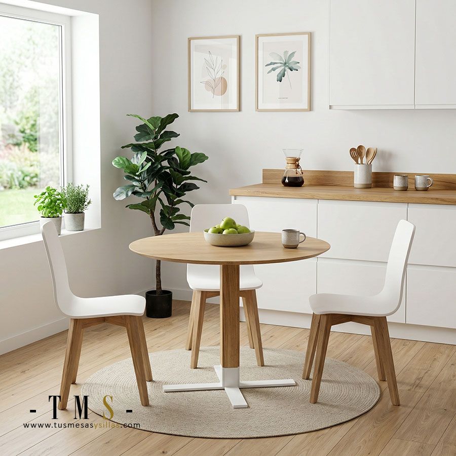 Mesa redonda para cocina o salón con encimeras de madera maciza de roble.