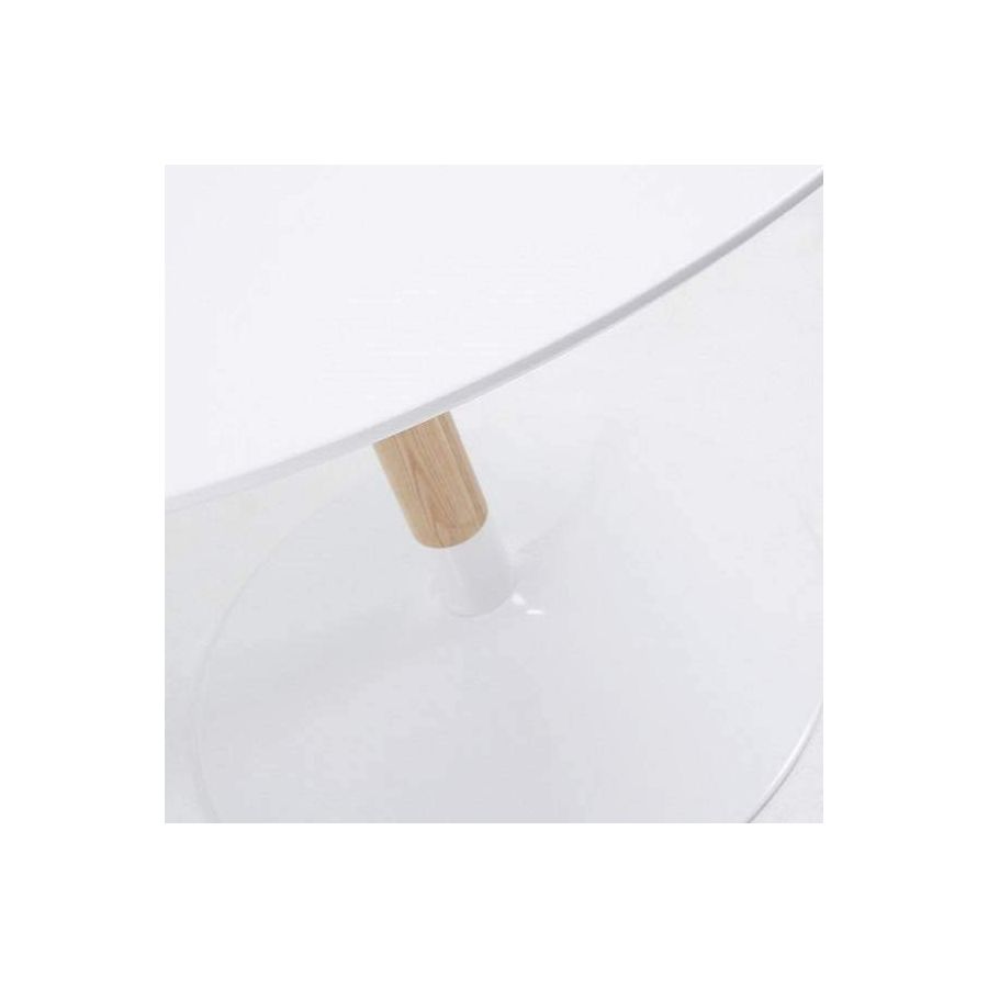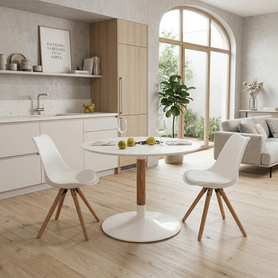 El resultado es una mesa redonda blanca y madera con una imagen fresca, ligera y elegante, ideal para ambientes nórdicos, contemporáneos y atemporales.