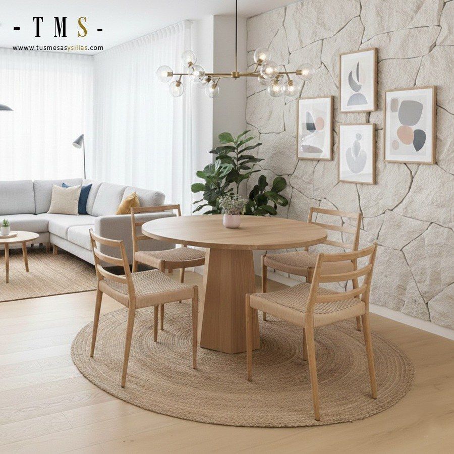 Mesa redonda de comedor de madera maciza de roble y pata central hexagonal