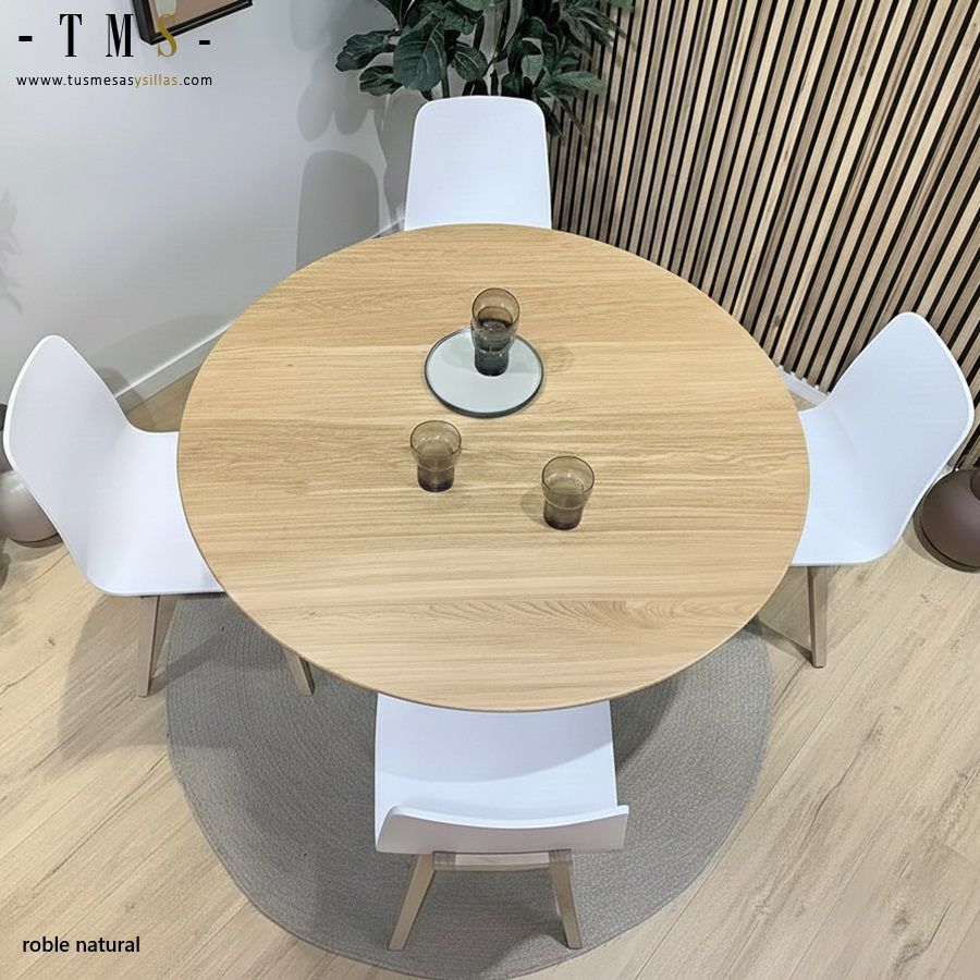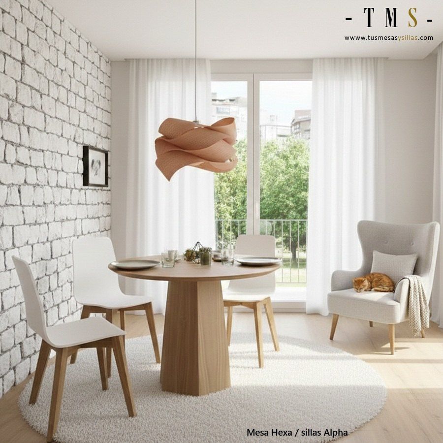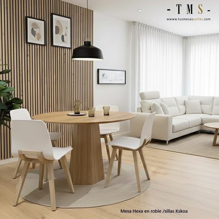 Las mesas redondas son un plus a la hora de reunirnos con nuestros seres queridos. Hexa es acogedora y cómoda y su pata central hace que podamos colocar las sillas donde queramos sin patas que resulten incómodas.