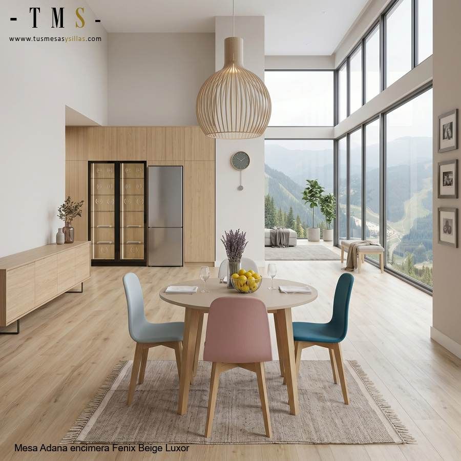 Forma parte de nuestra familia de mesas redondas de comedor. Si buscas una versión más compacta para uso diario, puedes verla en la Adana extensible para cocina y comedor.