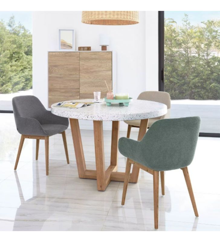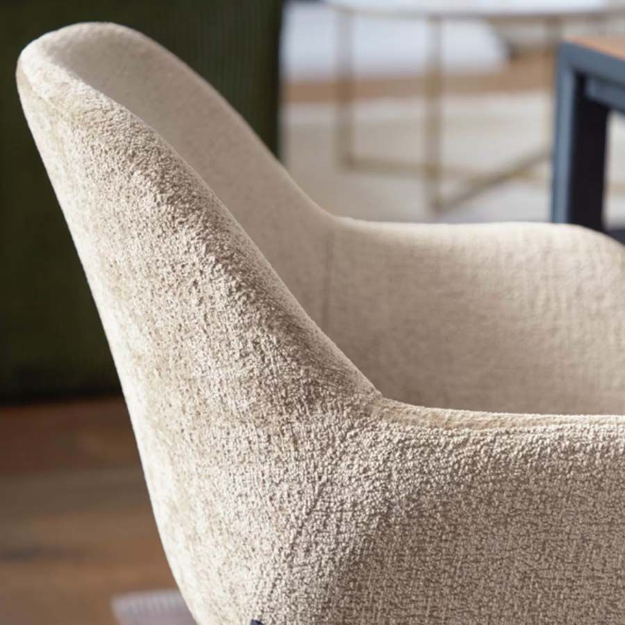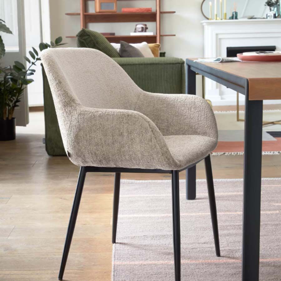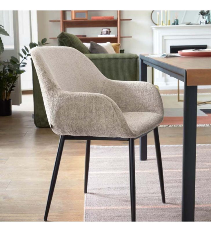 La silla Konna está tapizada en tejido efecto chenilla, un material muy actual que aporta calidez, suavidad al tacto y una imagen elegante, perfecta para ambientes nórdicos, modernos o contemporáneos.