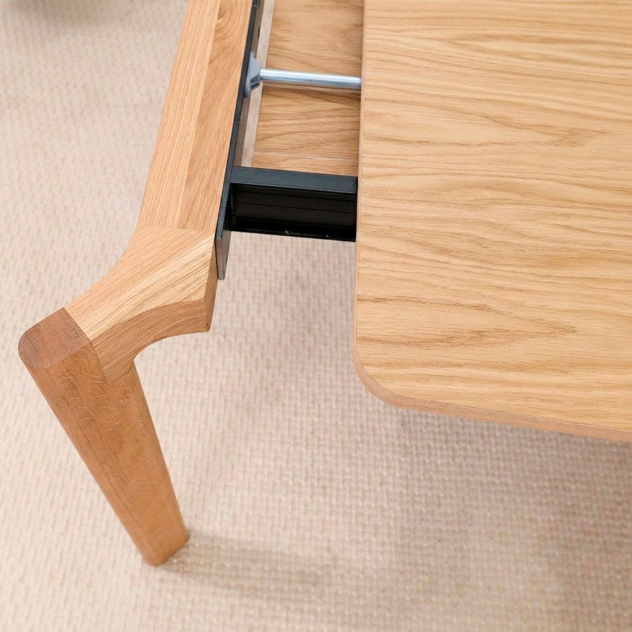 Sur une table extensible, le rail fait tout. Sur Itxaso, nous montons un rail de haute qualité pour un mouvement ferme, stable et fluide, même lorsque vous ouvrez la table à de grandes longueurs, jusqu’à 3 mètres, sans avoir besoin d’un pied central supplémentaire.