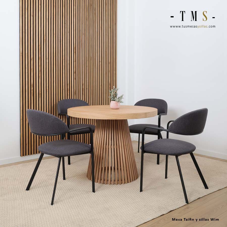 La table de salle à manger Taifin, en chêne et de 100 cm de diamètre avec deux rallonges de 50 cm, est parfaite pour les séjours où l’on souhaite optimiser l’espace sans renoncer au design. Ronde pour l’usage quotidien et allongée lorsque les invités arrivent.