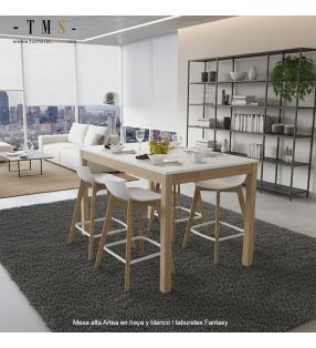 Queríamos para nuestra casa una mesa alta para poder comer con taburetes elevados, nos gusta mucho la combinación en blanco y madera y la muebles de cocina son blancos con la encimera maciza.