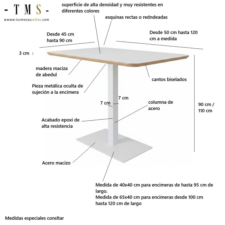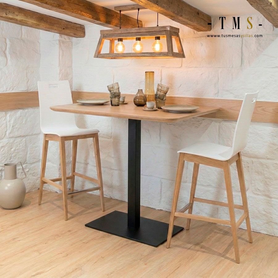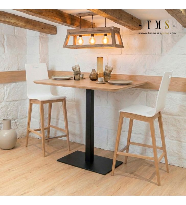 Pour une table haute à pied central, la solidité du piètement est essentielle et indispensable. Ce modèle dispose d’une base plate reliée à une colonne centrale carrée de 7 cm d’épaisseur, formant un ensemble ferme et stable.
