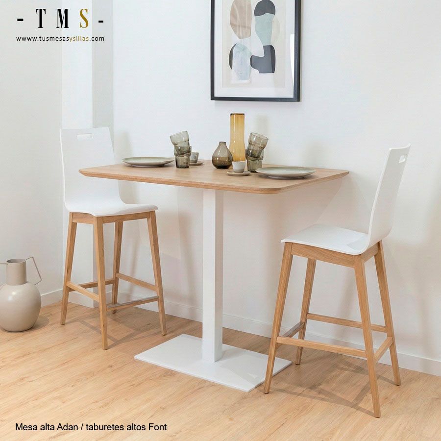 Une table à pied central optimise très bien l’espace disponible et est très agréable à utiliser : avec un seul pied, on s’assoit facilement sans gêne, et vous pouvez utiliser tout type de tabouret haut.