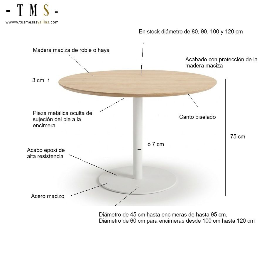 Dans ce cas, c'est avec un plateau en chêne massif , de 3 cm d'épaisseur et 90 cm de diamètre, les bords du plan de travail sont biseautés Un pour obtenir une esthétique minimaliste et un bord poli et attrayant, l'ensemble du comptoir est en bois massif et protégé par un vernis mat naturel afin qu'il puisse être facilement nettoyé.
