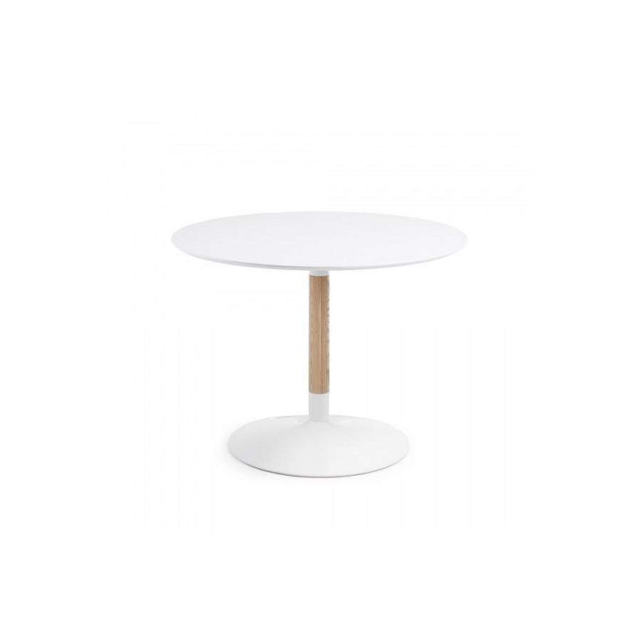 Table ronde Trick de 110 et 120 cm de diamètre, plateau blanc et piètement en bois