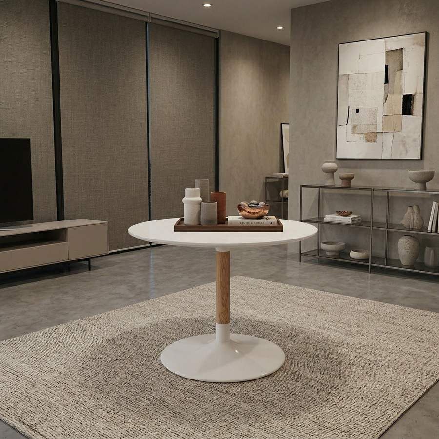 Les tables rondes blanches sont un excellent choix lorsque l’on cherche à renforcer la luminosité de l’espace et à conserver une esthétique plus légère. Dans le cas de la table Trick, le plateau blanc combiné au bois aide à créer des intérieurs plus chaleureux, agréables et équilibrés.